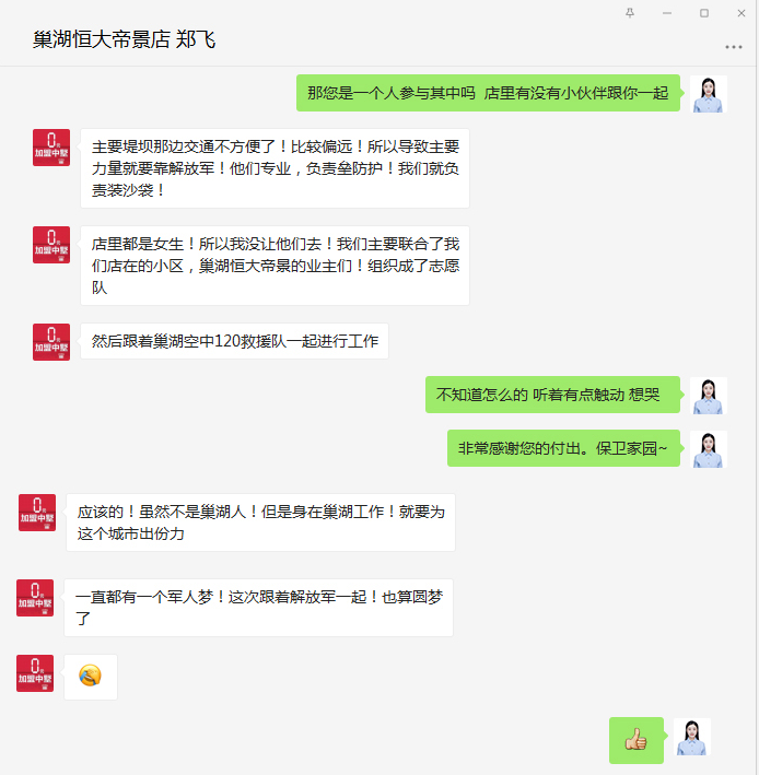 為了能讓更多的人參與支援,我號召了我們店所在的小區——巢湖恒大帝景的業主們,組織成了一支小分隊。”主要負責協助解放軍們裝沙袋,然后跟著巢湖空中120救援隊一起進行支援。